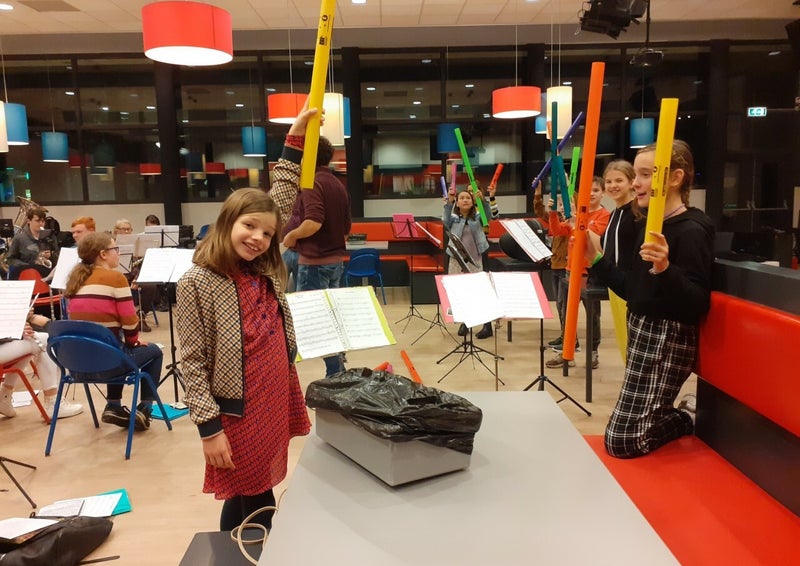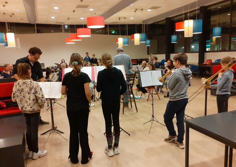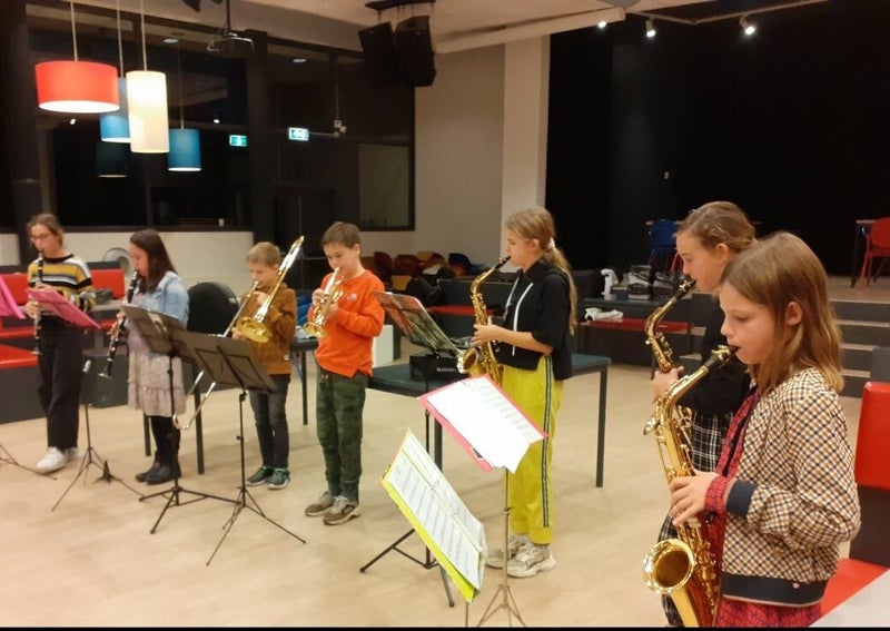 Afhankelijk van aanleg en inzet kunnen de jongste leerlingen al na enkele weken samenspelen in ons Blaasbandje. Dirigent Roel heeft als leraar en talentvol muzikant alles in huis om samen met zijn orkestje prettig te werken aan leuke liedjes op het niveau van de leerlingen. Dat repeteert niet alleen prettig, maar stimuleert de jonge blazers natuurlijk ook. Vooral omdat ze zich ook mogen laten horen bij gelegenheden als ons Nieuwjaarsconcert of het Kasteelconcert. Maar ze mogen ook zoveel mogelijk meedoen bij activiteiten van andere Gildenbondsorkesten.